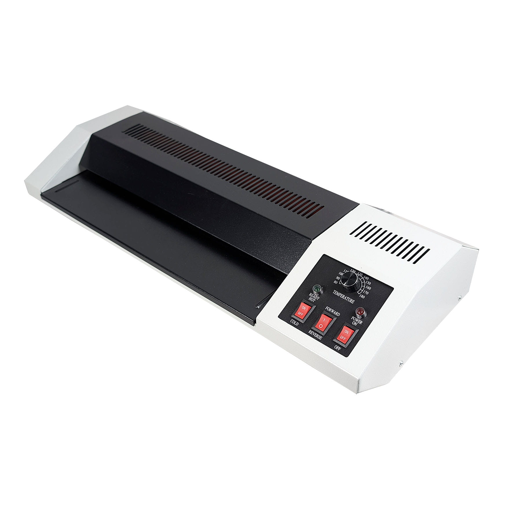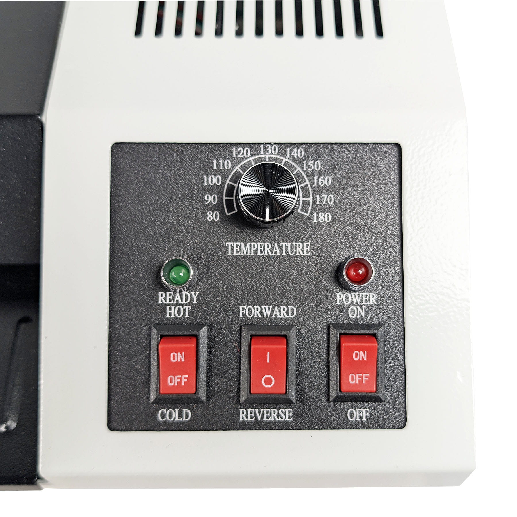 Laminator wyposażony jest w regulator temperatury, którym można dobrać odpowiednią temp. do grubości folii, funkcję cofania oraz diodę sygnalizującą gotowość do pracy.